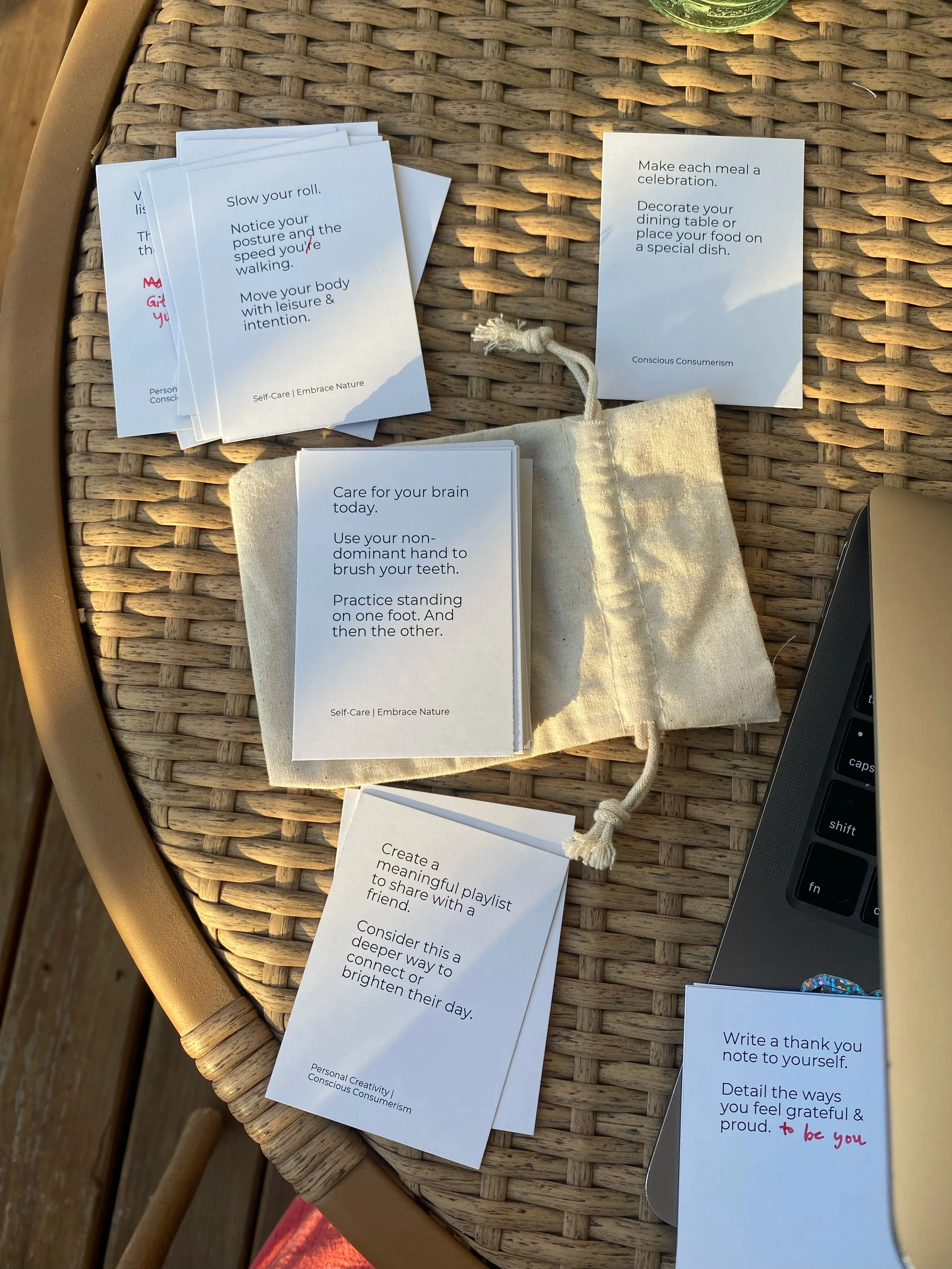 A nurturing tool designed to guide you through small, meaningful actions that can help lift your mood and restore balance, especially during challenging times. With 45 simple, yet powerful rituals focused on creativity, self-love, nature, and conscious consumption, these cards are perfect for when you need direction, hope, or a gentle reminder to care for yourself.
